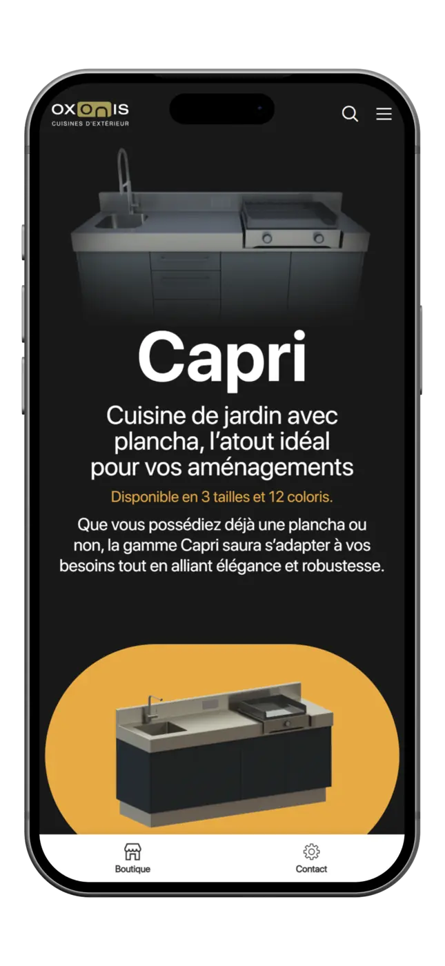 Le site a donc été conçu pour poser les bases de l’univers Oxonis : un positionnement premium, une image moderne et une mise en avant du savoir-faire autour de l’inox et des cuisines extérieures. L’identité visuelle, les choix graphiques et la structure du site ont été pensés pour refléter l’ADN de la marque et installer une image cohérente et professionnelle dès son lancement.